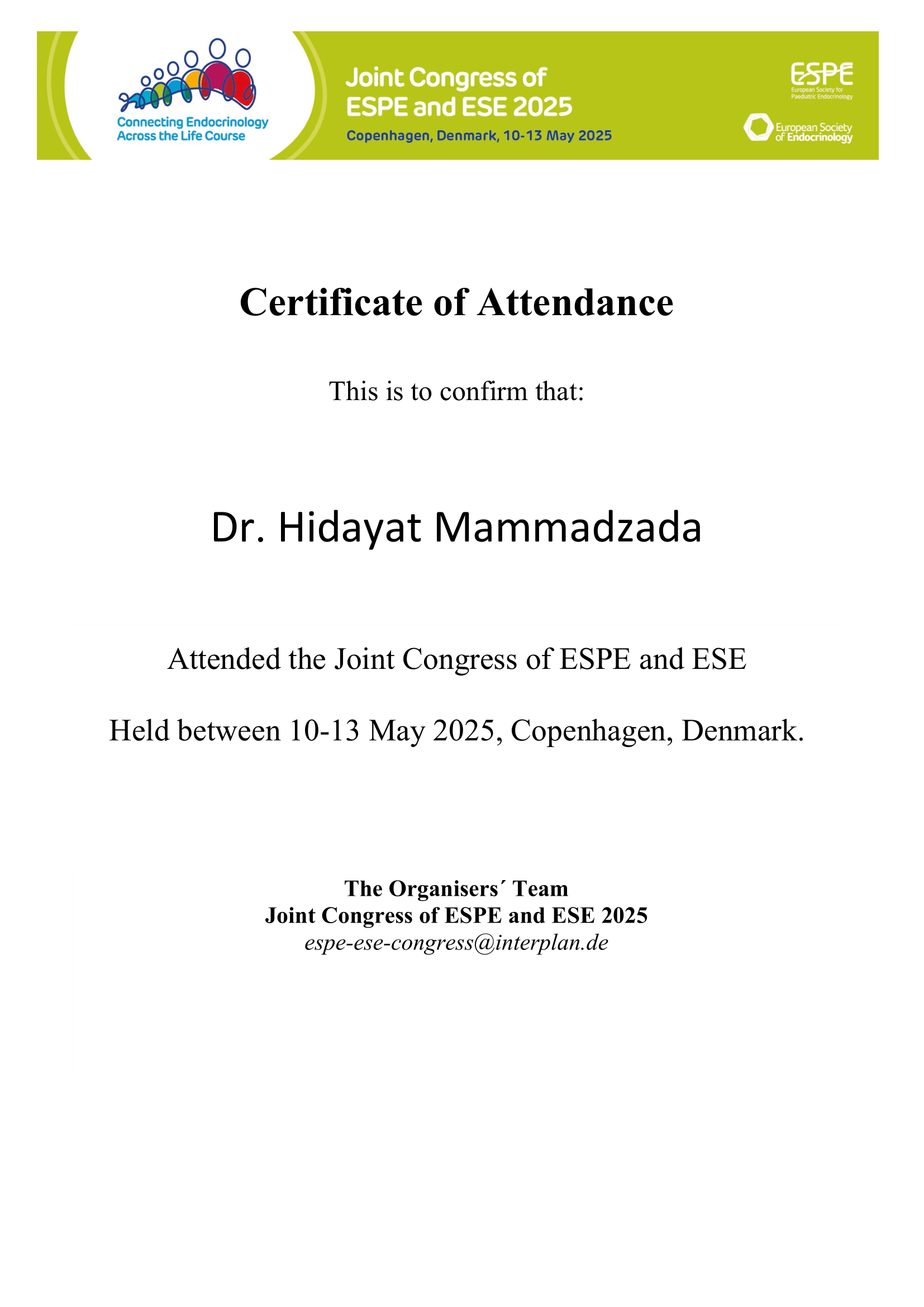 • 10-13.05.2025 Joint Congress of ESPE ( European Society for Paediatric Endocrinology) və ESE (European Congress of Endocrinology), Copenhagen, Denmark