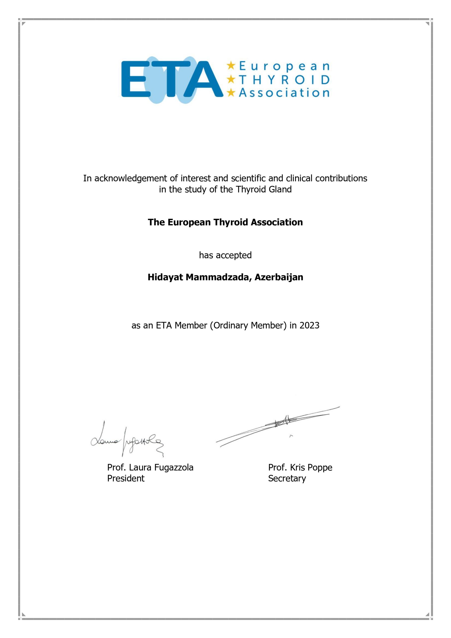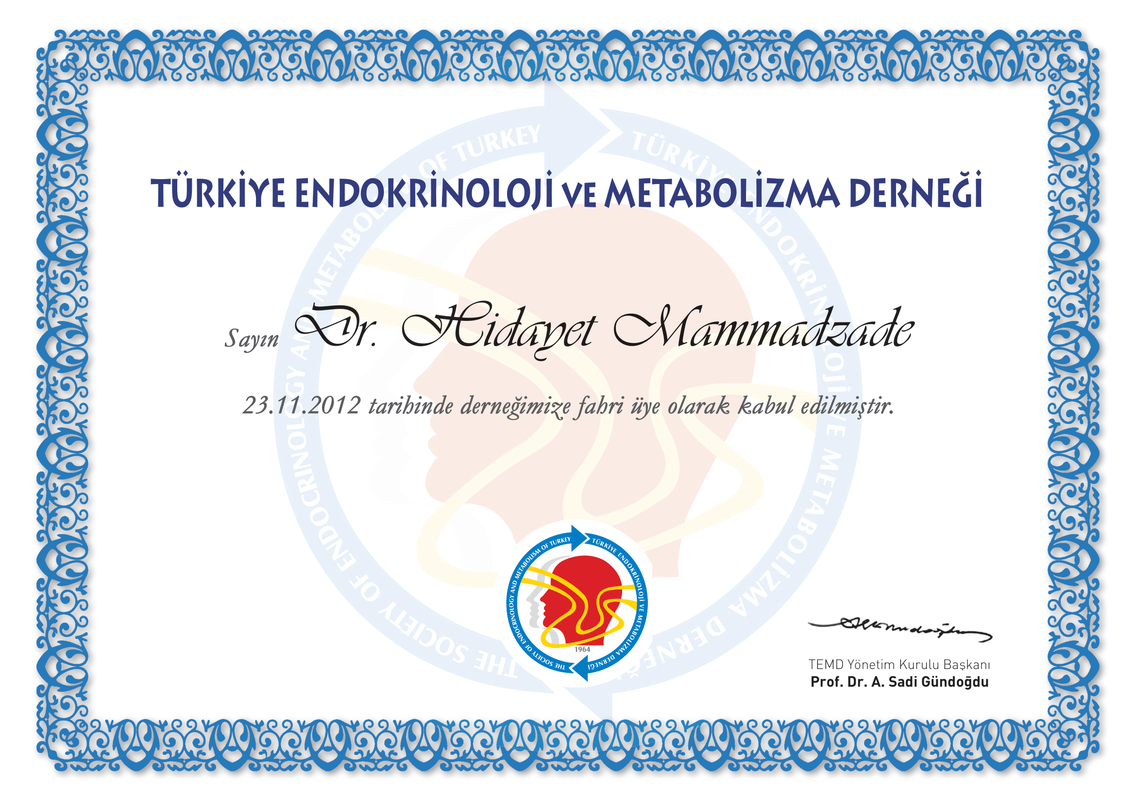• 28.11.2014 - 29.11.2014. Türkiyə Endokrinologiya və Metabolizma Dərnəyinin İrəli tireoid ultrasonoqrafiya və EUGOGO (European Group on Graves' orbitopathy) kursu (Ankara, Türkiyə) keçmişdir