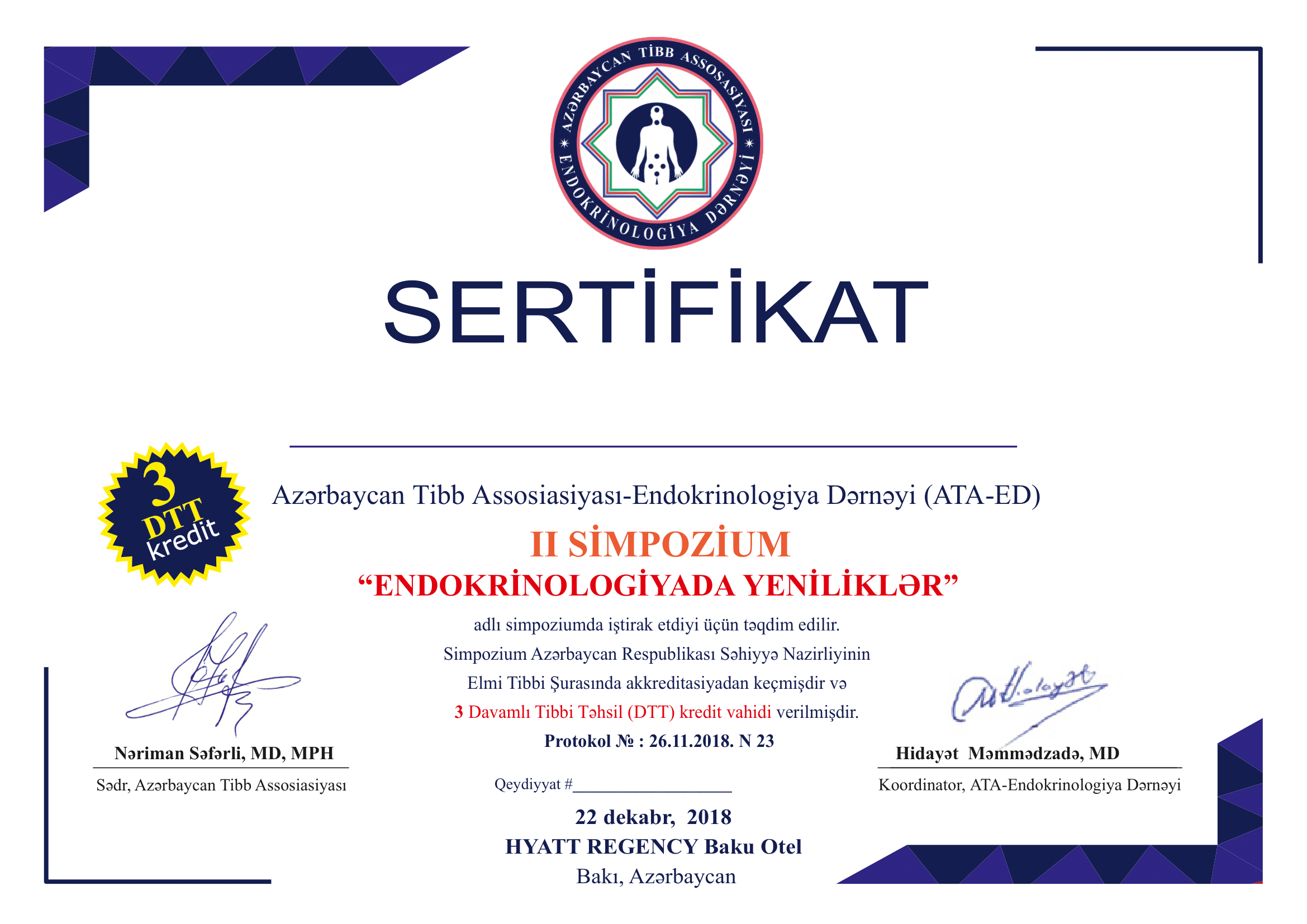 • 09-13.05.2018 Türkiyə Endokrin və Metabolizma Dərnəyinin 40-cı Beynəlxalq Endokrinologiya konfransı- Antalya, Türkiyə