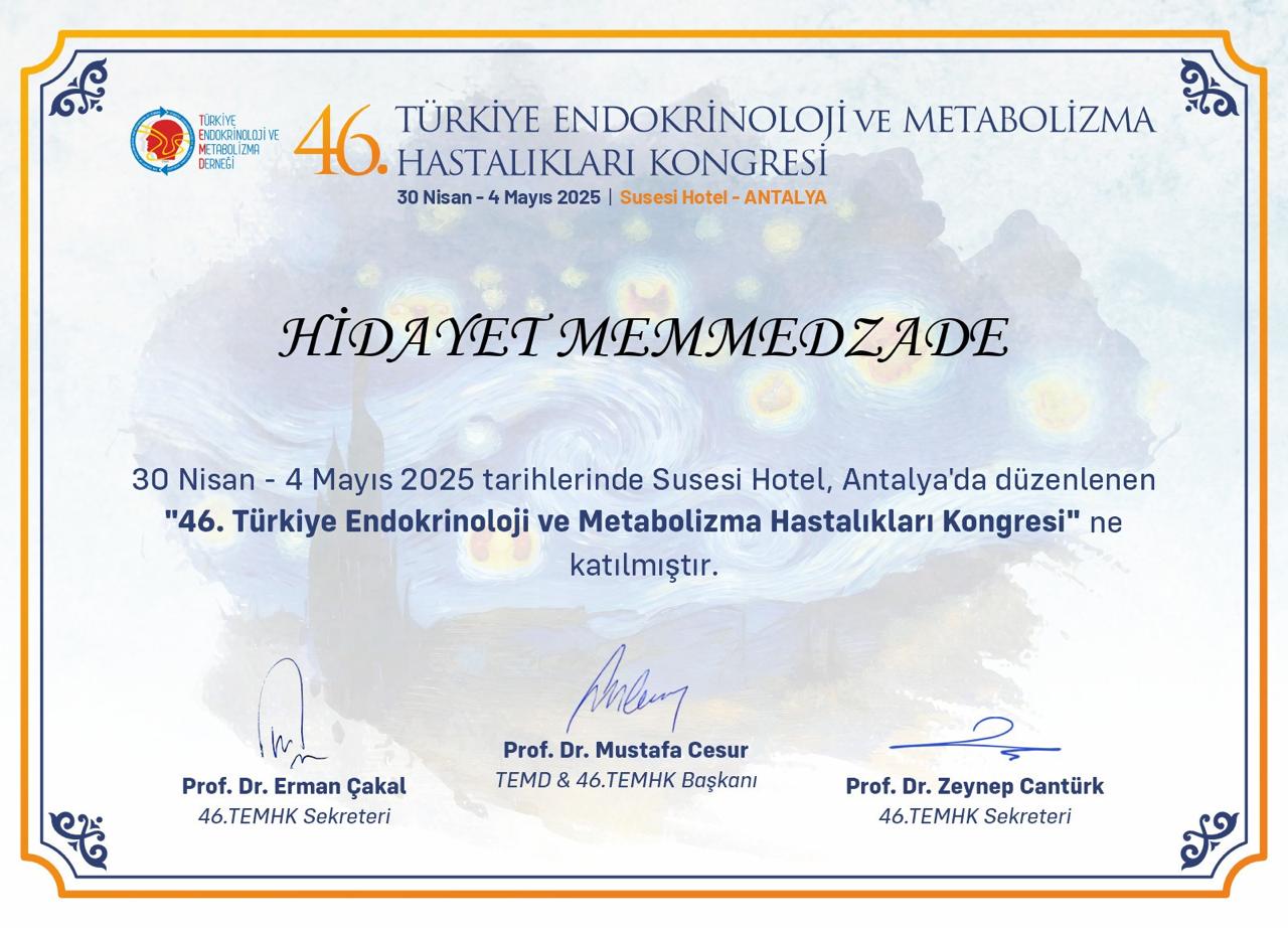 • 30.04.2025-04.05.2025 Türkiyə Endokrinologiya və Metabolizm Dərnəyinin 46-cı beynəlxalq endokrinoloji konfransı, e-poster, sözlü sunum təqdimatı, Antalya, Türkiyə