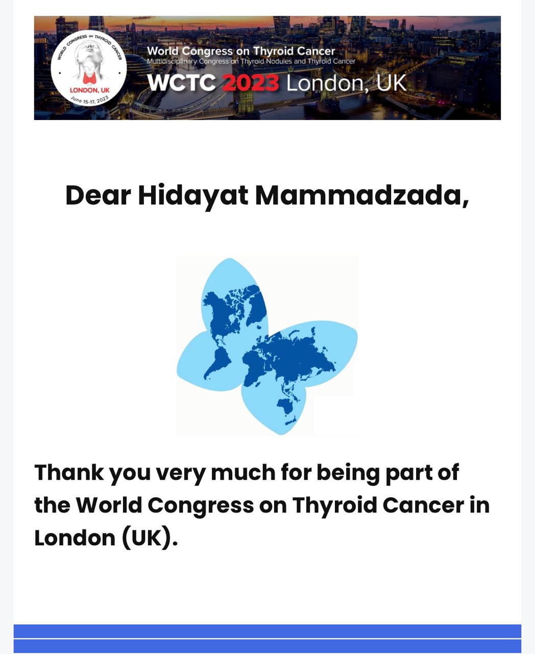 • 15.06.2023 - 17.06.2023. Dünya Tireoid Xərçəngi konqresi (The World Congress on Thyroid Cancer -WCTC 2023), Balkan və Qara Dəniz tireoid xərçəngi işçi qrup (Balkan and Black Sea(BBS)Thyroid Cancer Working Group) toplantısı, spiker və moderator, Birləşmiş Krallıq, London