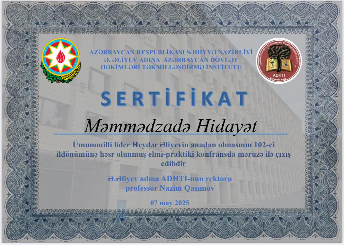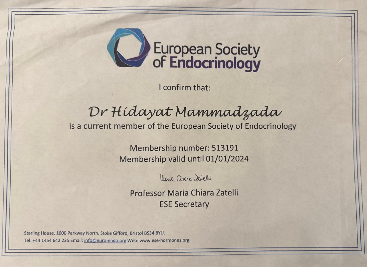 • 01.05.2008-30.06.2008 Əziz Əliyev adına Azərbaycan Dövlət Həkimləri Təkmilləşdirmə İnstitutu (göndəriş - 7285) I Daxili xəstəliklər kafedrası “Klinik endokrinologiya” kursu üzrə tematik təkmilləşmə;
