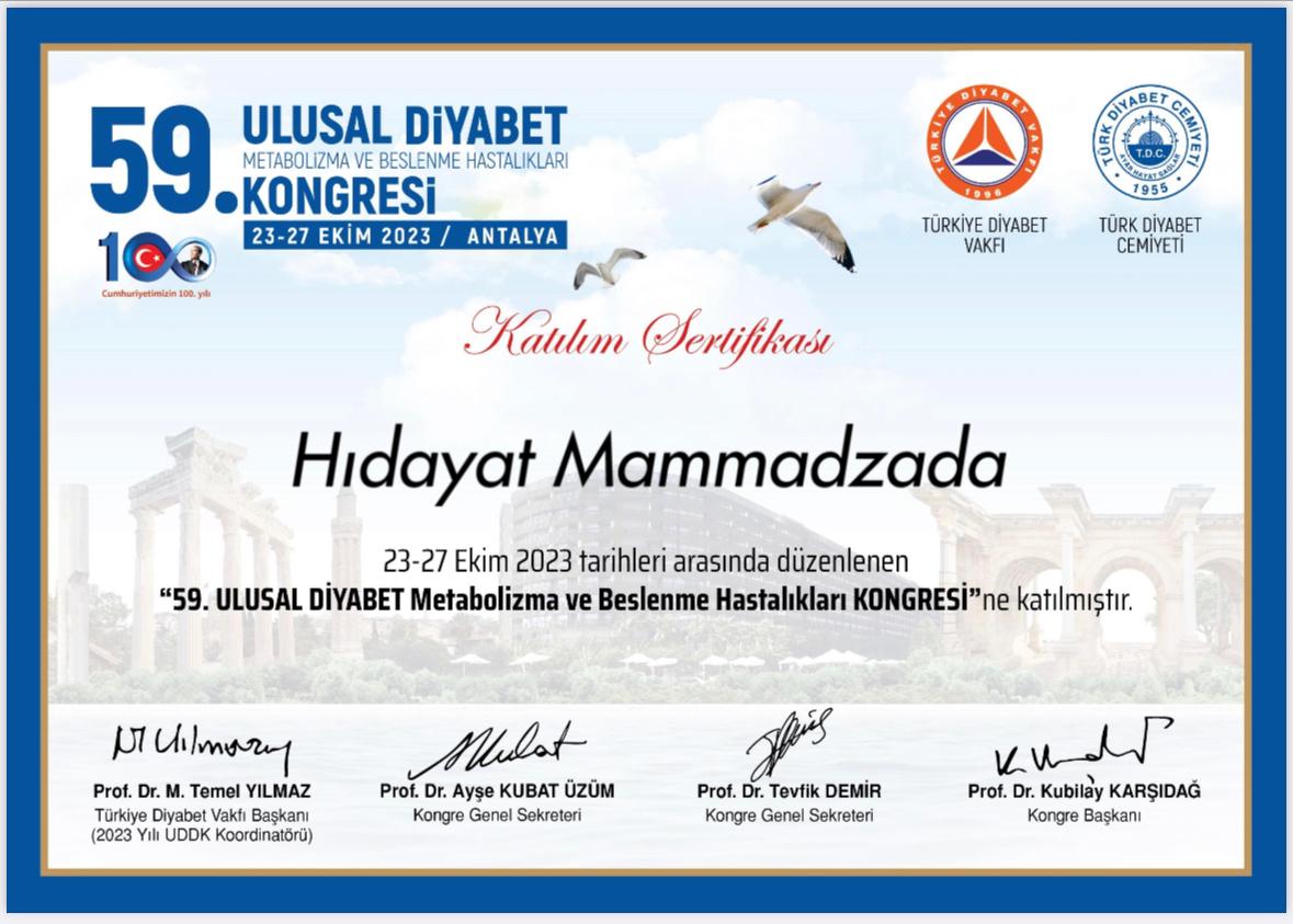 • 21.10.2023 - 27.10.2023. 59-cu Ulusal Diabet konqresi, bildiri poster təqdimatı, Antalya, Türkiyə